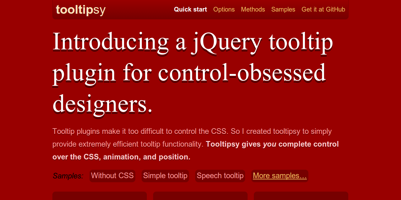 Besides the insane bleeding edge design, it’s actually a very cool plugin for creating interactive and CSS native tooltips. You’re also able to use AJAX to make some cool stuff come together, I enjoyed the ‘flying’ tooltip example a lot.